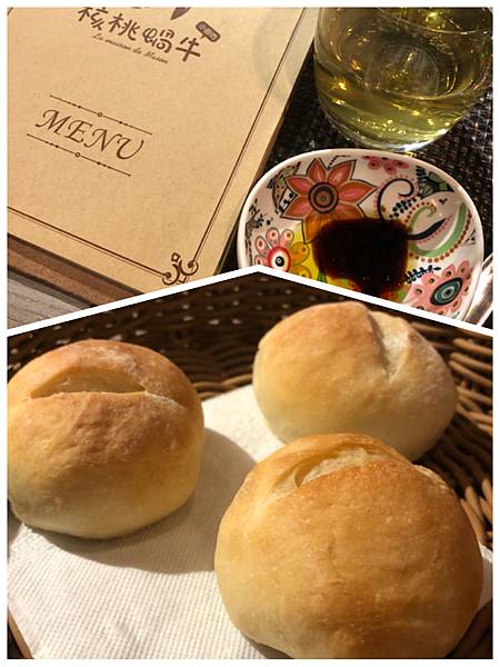 㐃喝光整杯草本茶,3人附餐麵包溫熱登場,醮著油醋,口感OK,再等待現點現做的餐點。